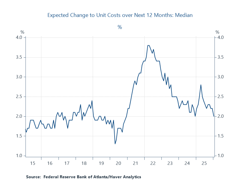 Paging President Bostic. The Atlanta Fed's Business Inflation Expectations Survey shows that the expected change to units costs over the next 12 months slid to 2.0 in January, the lowest since December 2024. Firm inflation expectations seem fine.