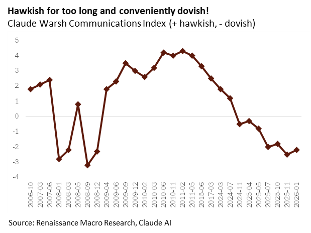 Finally, Warsh turned dovish, somewhat abruptly in wait for it, Nov 2024. Since Trump’s election, he has been talking up growth optimism, productivity driven disinflation and rate cuts. That pitch will be much harder to make around the FOMC table than it was in the Oval Office.