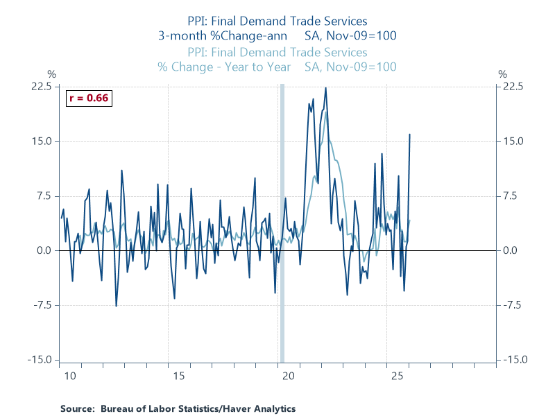 Final demand trade services surged 2.5% in January. This is a warning that inflationary pressure has built up in the distribution chain. Producers have increased prices above costs, which means they have room to pass on the costs of tariffs down to buyers.