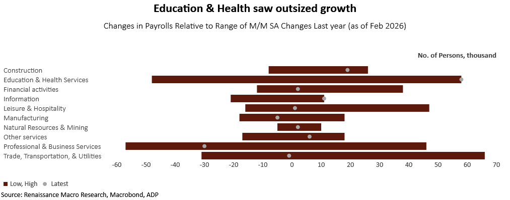 In ADP, much of the jobs growth came from education & healthcare services. In February, education & healthcare services rose 58,000, the most in any month over the last year. Ex-education & health, ADP has been treading water for the last 6-7 months.