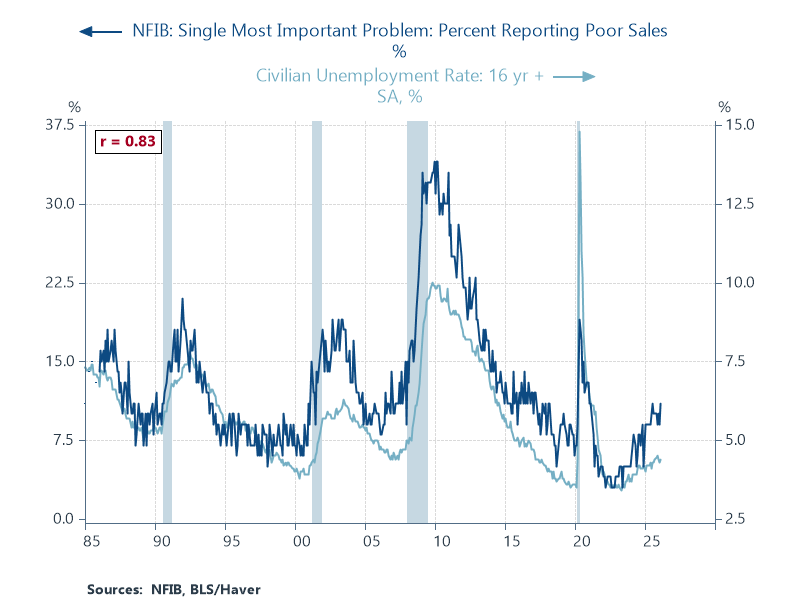 According to the February NFIB small business survey survey, 11 percent of respondents list "poor sales" as their single-most important problem, the highest level since July 2025 and up 2ppts from the previous month. Historically, this is not the best sign for the labor market.