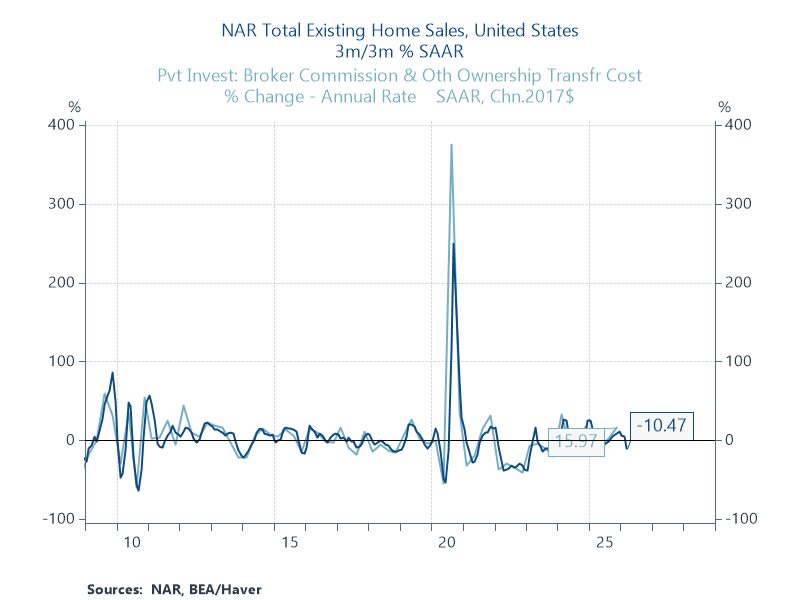 Residential investment is likely to weigh on Q1 GDP. In March, existing home sales declined 3.6%. Taking the average of Jan-Mar against the average of Oct-Dec, existing sales are down 10.5% SAAR. This will weigh on brokers' commissions, which is about 1/5th of resi investment