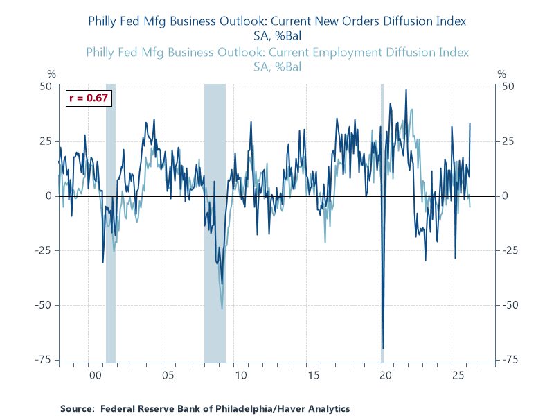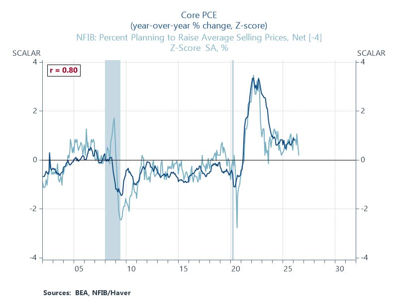 Small firms see price pressures abating. According to NFIB, the percent of firms planning to raise average selling prices slid to 24 in March, the lowest since July 2024. That plans to raise prices have slid even as oil prices have increased might imply limited pass-through.