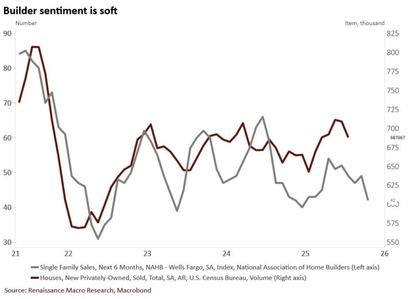 Housing remains stuck in the basement. The NAHB Housing Market Index (HMI) hit a seven-month low of 34 in April. Present sales sank to 37 while six-month expectations soured to 42, the lowest level since June 2025 as buyer traffic remains anemic.