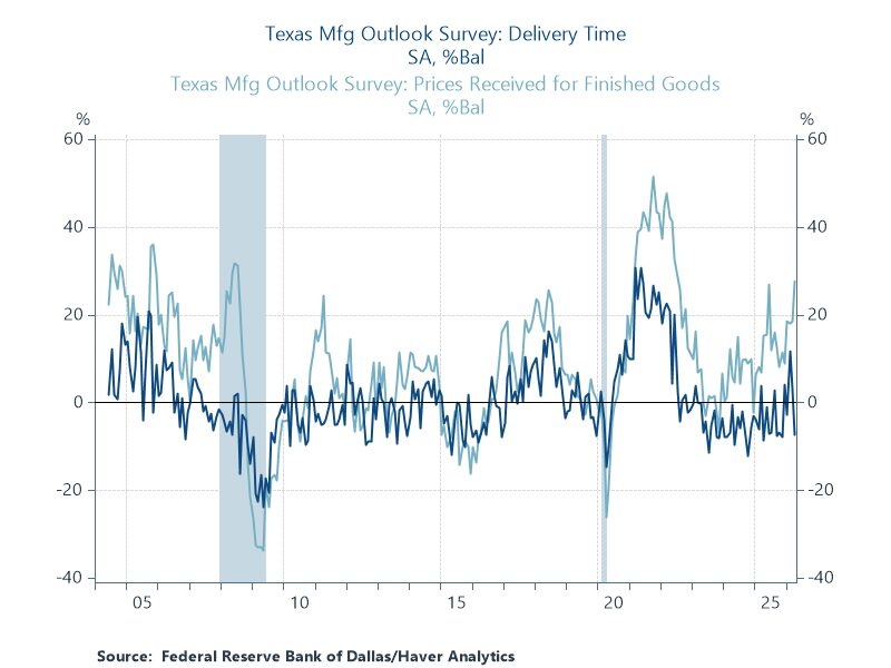 In the Texas Manufacturing Outlook Survey, it is clear that price pressures are building for the District's manufacturers as of April. However, unlike 2022's run-up, delivery times eased over the month.